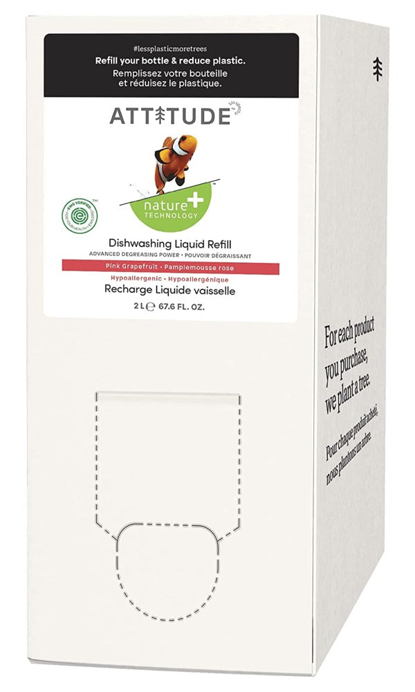 Attitude - Dishwashing Liquid Pink Grapefruit - 2 2 L Litres - NPN: 00000000 -- ECO-FRIENDLY LIQUID DISH SOAP REFILL: Our BULK to go container uses 68% less plastic and includes 5 times more product than its bottle counterpart which means less packaging waste!BULK DISH SOAP THAT WORKS: Our effective grease-cutting formula helps remove stubborn food residue from dishes, pots & pans. That means less scrubbing, more free time!PLANT BASED FORMULA: Made of plant based ingredients that meet the highest EWG health standardsHYPOALLERGENIC DISHWASHING LIQUID: Because we care about the most sensitive skins too! Our dish soaps are dermatologically tested, hypoallergenic & non-irritating for your skinVEGAN AND CRUELTY-FREE: PETA Approved, Proudly Vegan & our products are never tested on animals. They are also ECOLOGO Certified: sustainable and biodegradable