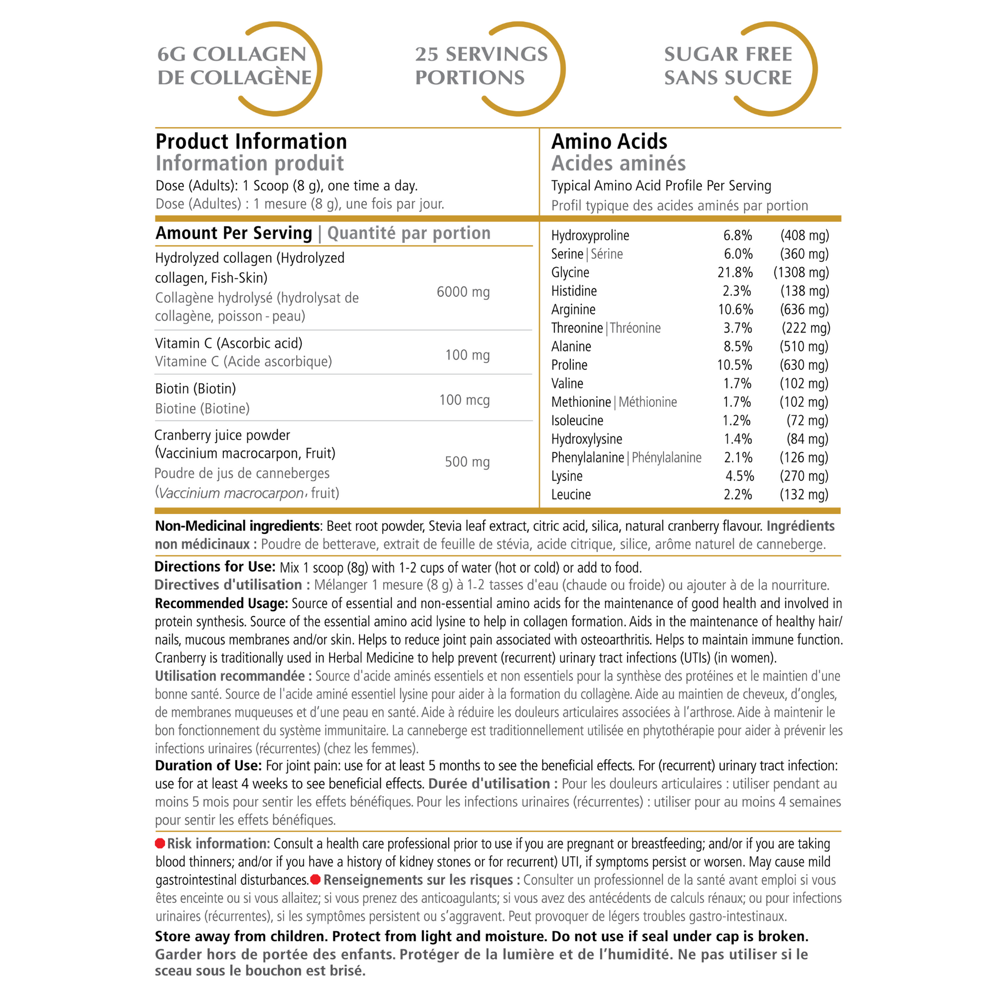 Marine Collagen + Cranberry combines the benefits of Canadian-made marine collagen with the incredible antioxidant superpower of cranberry to feel and look your best everyday. The properties of cranberry prevent Urinary Tract Infections while marine sourced collagen protects and regenerates the collagen in your skin and body to strengthen hair, skin, nails and joints. Keto Friendly. All Natural.